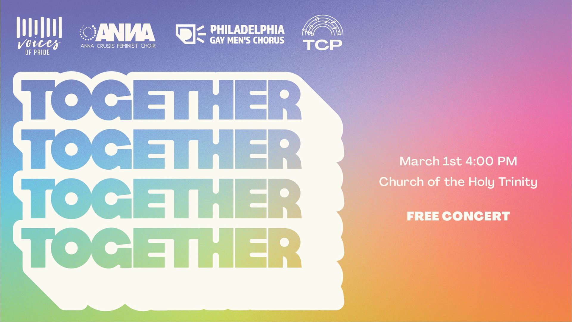 Our annual combined concert with ANNA Crusis Feminist Choir, Philadelphia Voices of Pride, and Transcendent Choir of Philadelphia